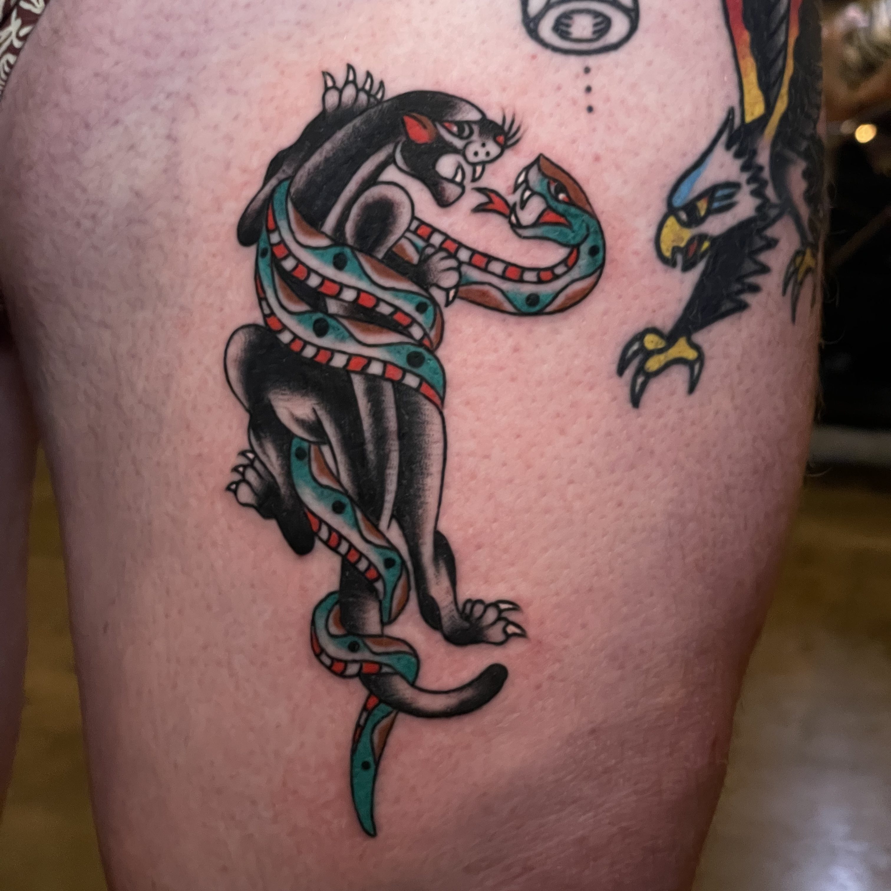 The third tattoo I got is a panther with a snake wrapped around it. I got this on my birthday in 2023. This was done by Dante at Chapter One Tattoo in Ocean Beach, CA. I really like this traditional style design. Overall took about 2.5 hours to be done.