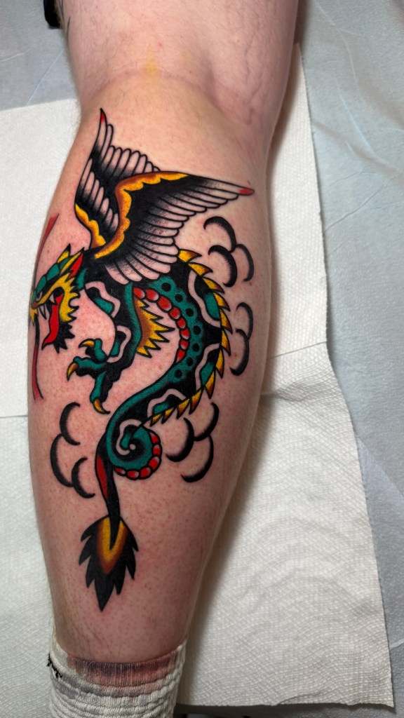 The dragon on my calf was done by Braden at In the Moon tattoo. I got this one the same day as the panther face. Calf was a pretty rough spot to get tattooed. My leg kept spasming and some of the parts hurt real bad. Took about 2.5 hours. Definitely the biggest piece I have, also probably the most painful so far.