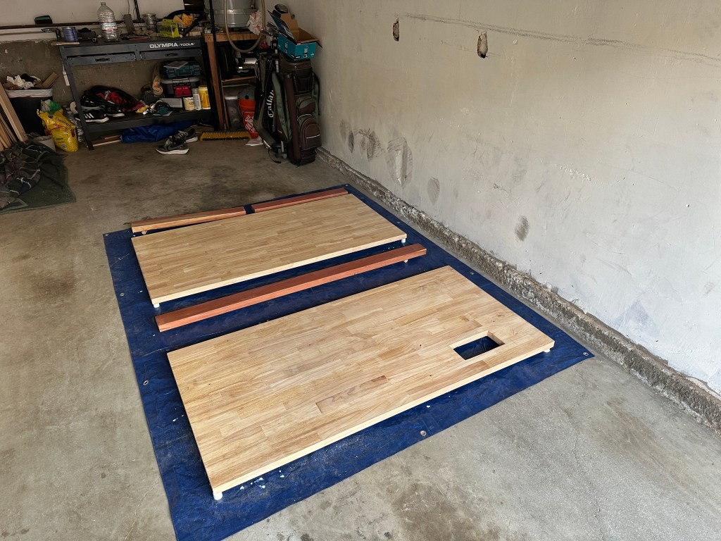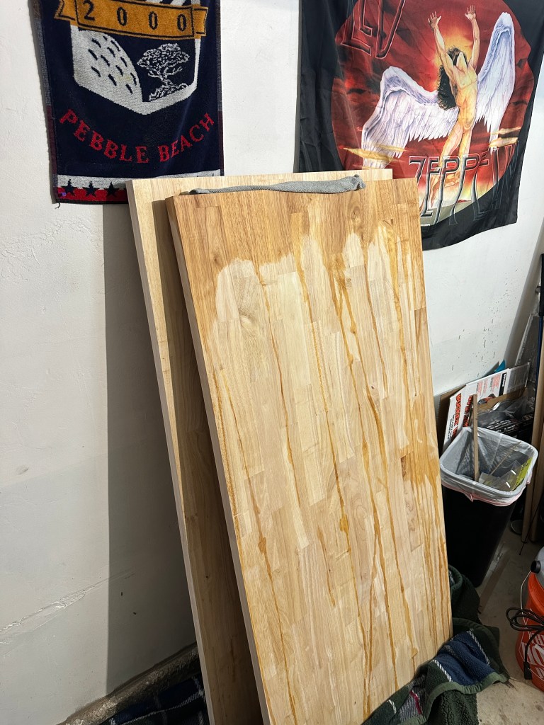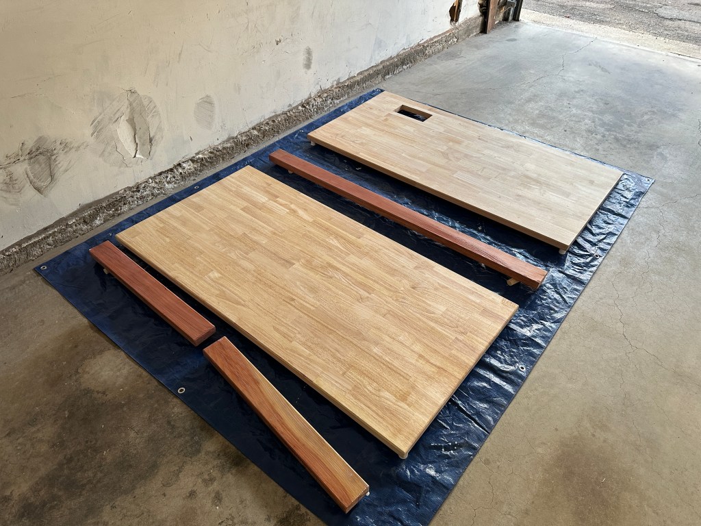 The next step in material prep was to seal the wood. I used the General Finishes High Performance in dead flat. It was pretty easy to apply. I laid out a tarp and used the end caps from PVC pipe on the four corners to elevate off the tarp. You’re supposed to apply ~3-5 coats for surfaces that are high wear, and it takes ~2-3 hours between each coat. To do 3 coats on each side it would take at least 12 hours of waiting. I ended up doing 3 coats on the bottom side of each and 5 coats on the actual desk surfaces. I had to rush it a bit as it was occupying my garage and taking my parking spot. I wish I had done more work to each block between coats, sanding them would’ve gotten rid of a lot of imperfections and drip marks. They aren’t too obvious in the final product so its alright.