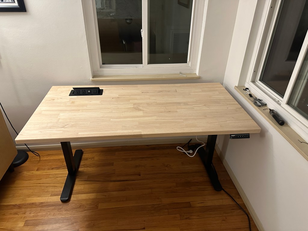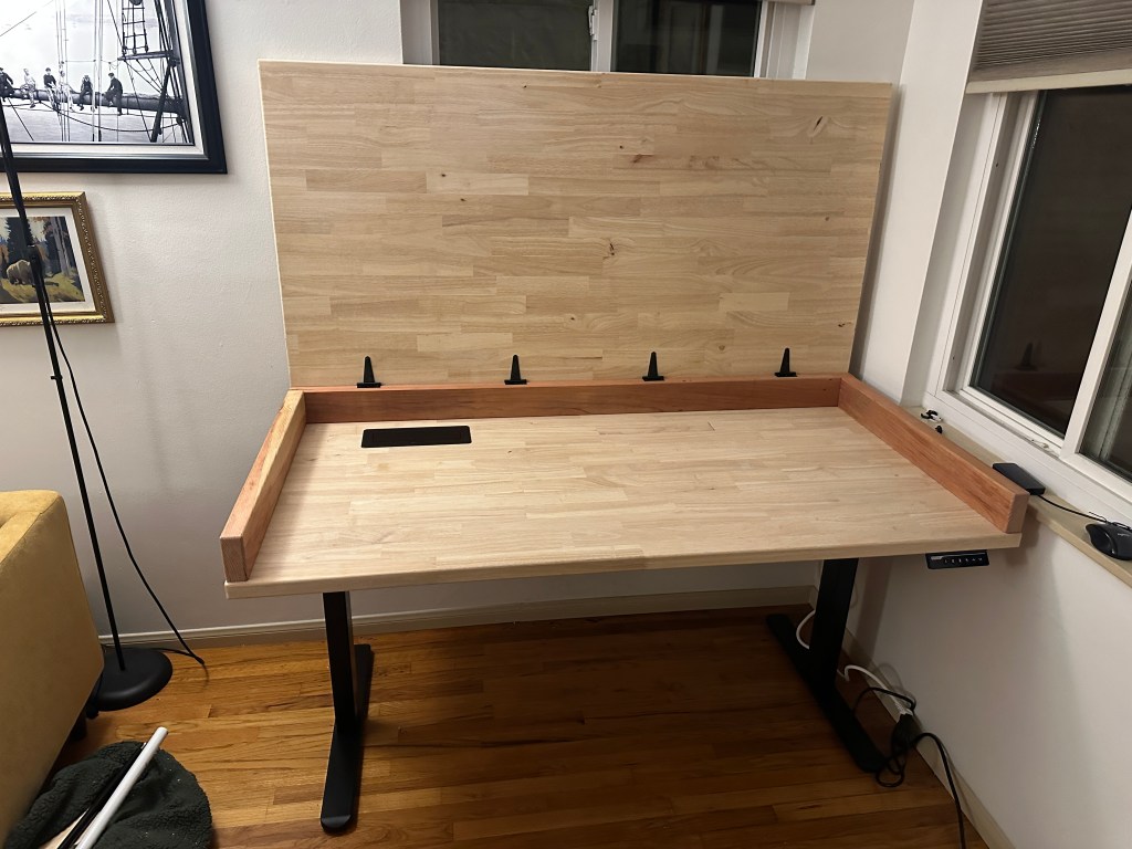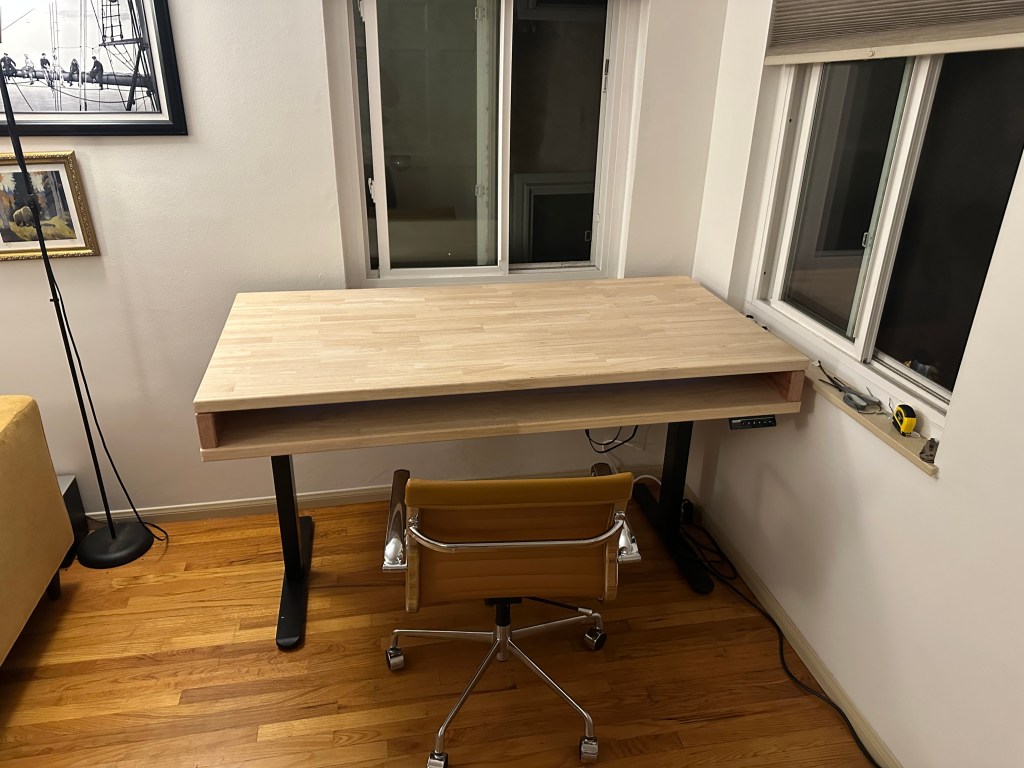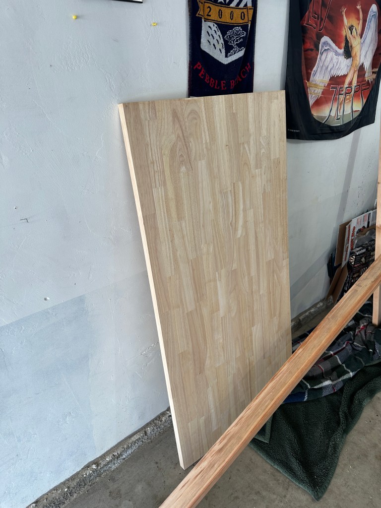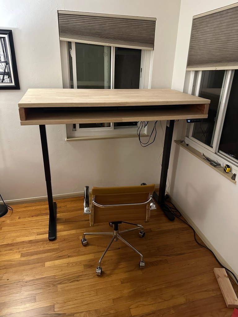 Before I started, I looked into what I would like to implement into the desk and what materials I would need to source for it. Some ideas I wanted to implement were having standing desk legs, a popup plug on the lower surface, and pressurized struts to help lift the desk top with monitors. Some materials I would have to source were all of the ideas I wanted to implement and butcher block slabs for the desk top. I thought butcher blocks would be the best material because it would provide enough rigidity to not sag with the monitors mounted and was unfinished so I could decide what finish to use. Other options I looked at that would’ve been cheaper were plywood (I didn’t think it would be rigid enough and they tend to come warped) or tabletop from ikea (not the worst idea, would be finished already). I found it was easier for me to order and pickup from LA than to source one in San Diego so that’s what I did.
