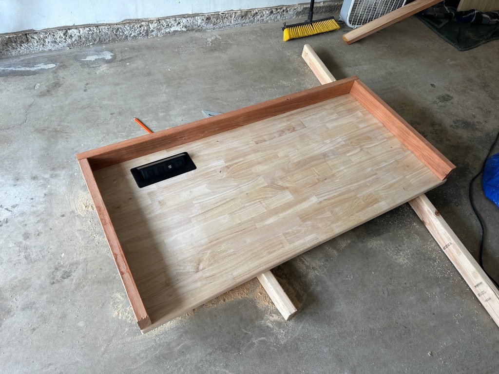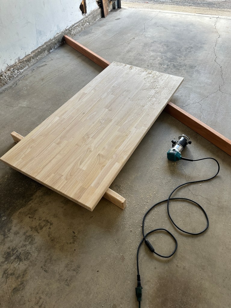 Once the initial prep work was completed, I began the material prep. I started by using a router to round all of the edges of the top board. I started on an edge I knew would be away from sight most of the time to ensure it looked and felt good on the butcher block (butcher block is expensive, it feels scary to work on initially). I used a jigsaw to cutout the spot for the popup outlets. For the 2″x4″ frame, I aligned the boards with the block to ensure they were the perfect length then used a chop saw to cut them to size.