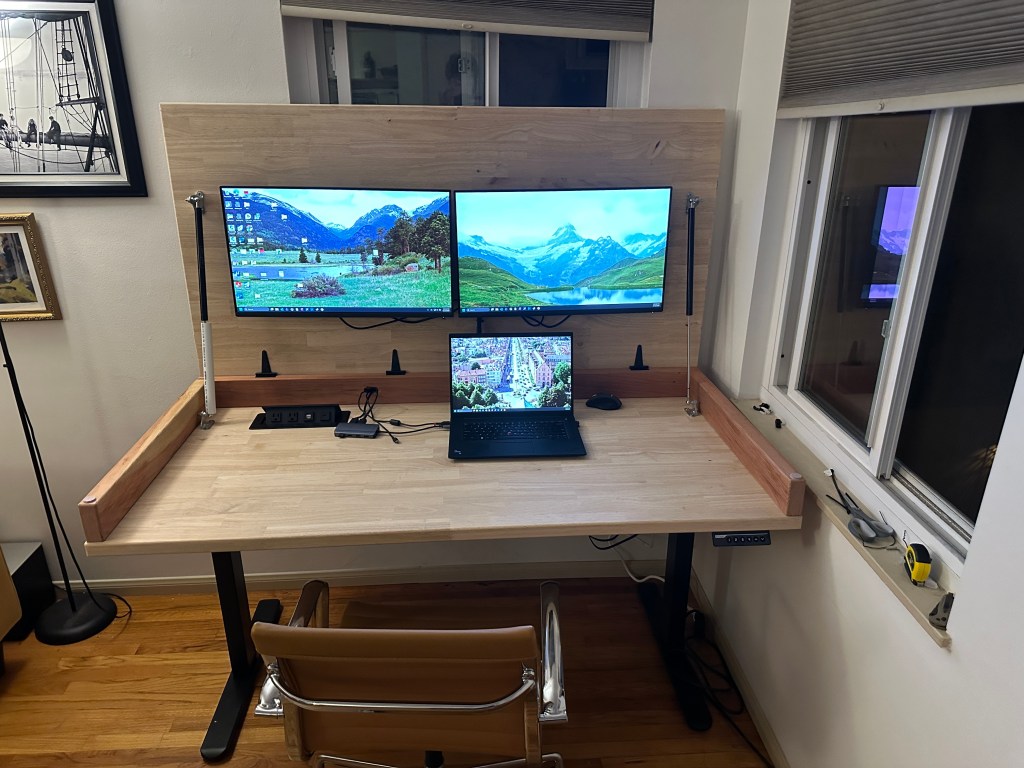 The last step was wire management. I drilled a hole in the back of the frame to be able to feed the monitor HMDIs and power, then another to feed the HDMIs and laptop power cables back into the desk area. The standing desk legs came with a metal sheet that folds into a little basket to hold wires. I also utilized the included stick on wire tie downs, I’d recommend screwing them in to be more secure.