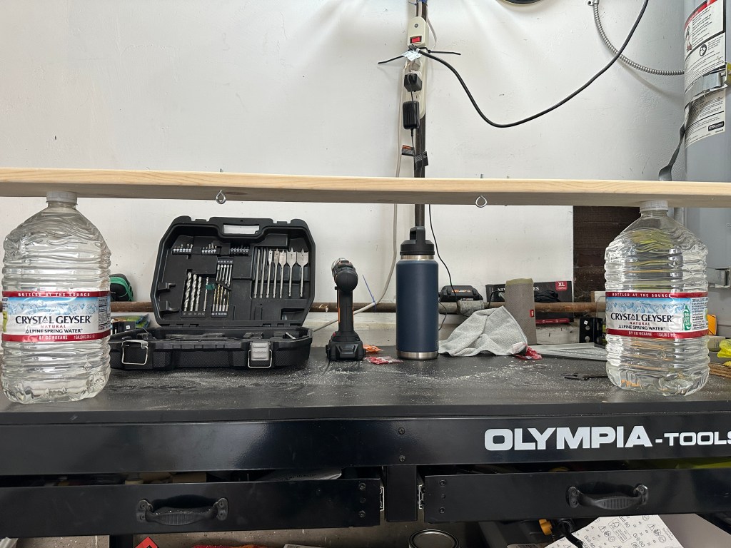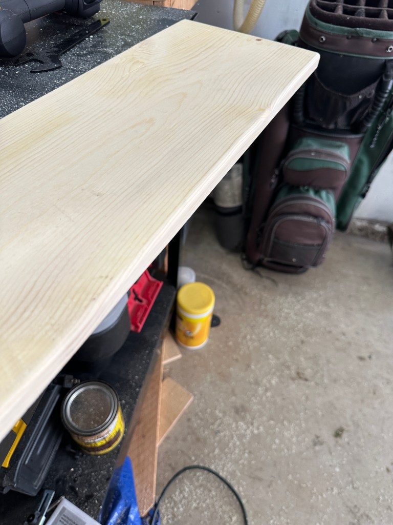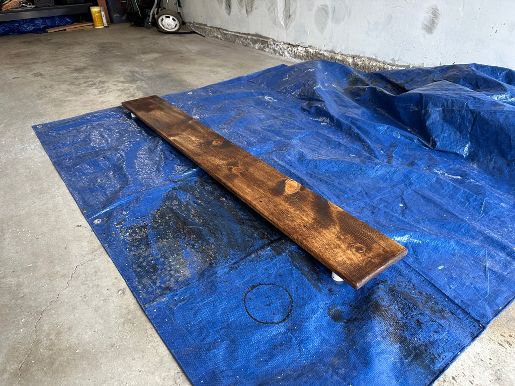 I cut the board down to the dimensions I needed, then used the router to round all of the outward facing edges. I always find it difficult to get good lumber at home depot, it inevitably is not perfect. I always try to consider what edges will be most visible when picking which sides will be facing out and up/down. In this case, there was a little piece missing out of it, since the shelf is mounted high up, I had that be on top so it’s out of sight. I also ensured the stain on the bottom was applied most evenly since that would be more visible.