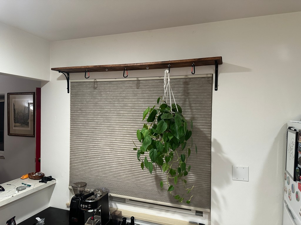 There were a few constraints. I wanted to have the plants hung roughly 4″-6″ off the face of the wall, I needed a way to support ~25 pounds of hanging plants, it needed to span the whole ~5′ wide window, I wanted to have some flexibility of how many plants and their spacing, and I was hoping it would fit in with my apartment decorations aesthetically.