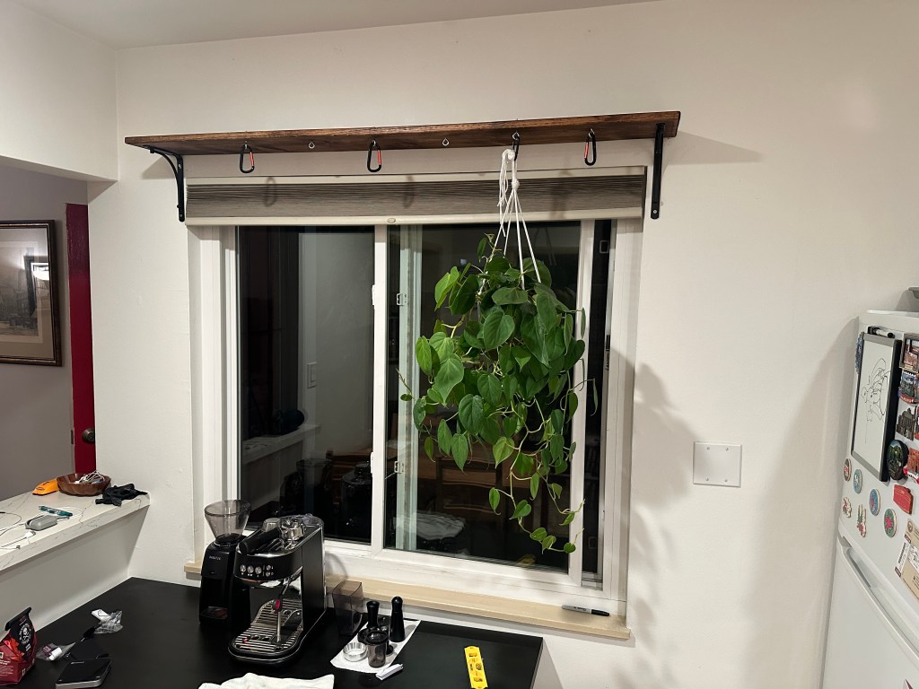 I considered using a heavy duty curtain rod, but the options I saw at home depot were limited in how far they would be from the face of the wall and also didn’t seem sturdy enough for the application. I decided instead I would hang a shelf above the window and find a way to hang plants from there. I thought some sort of rod (similar to a closet hanging rod) would be good. I ended up not finding a good option for that either, so I settled on drilling 7 holes throughout the shelf and using I hooks to hang the plants from. I’m pretty satisfied with how it came out.